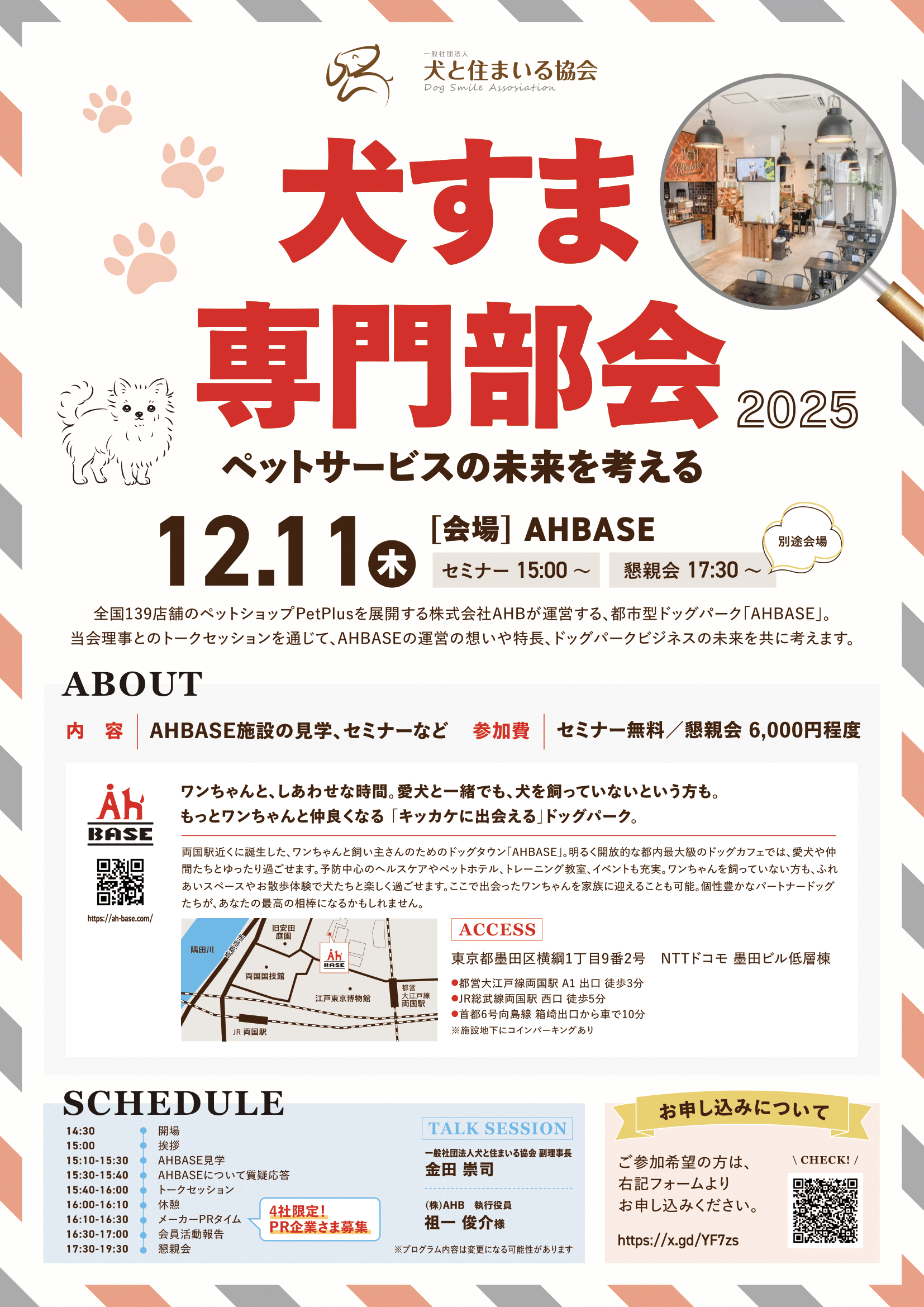 この度、12月専門部会の開催が決定いたしました。今回は「ペットサービスの未来を考える」をテーマに開催いたします。 全国139店舗のペットショップPetPlusを展開する株式会社AHBが運……