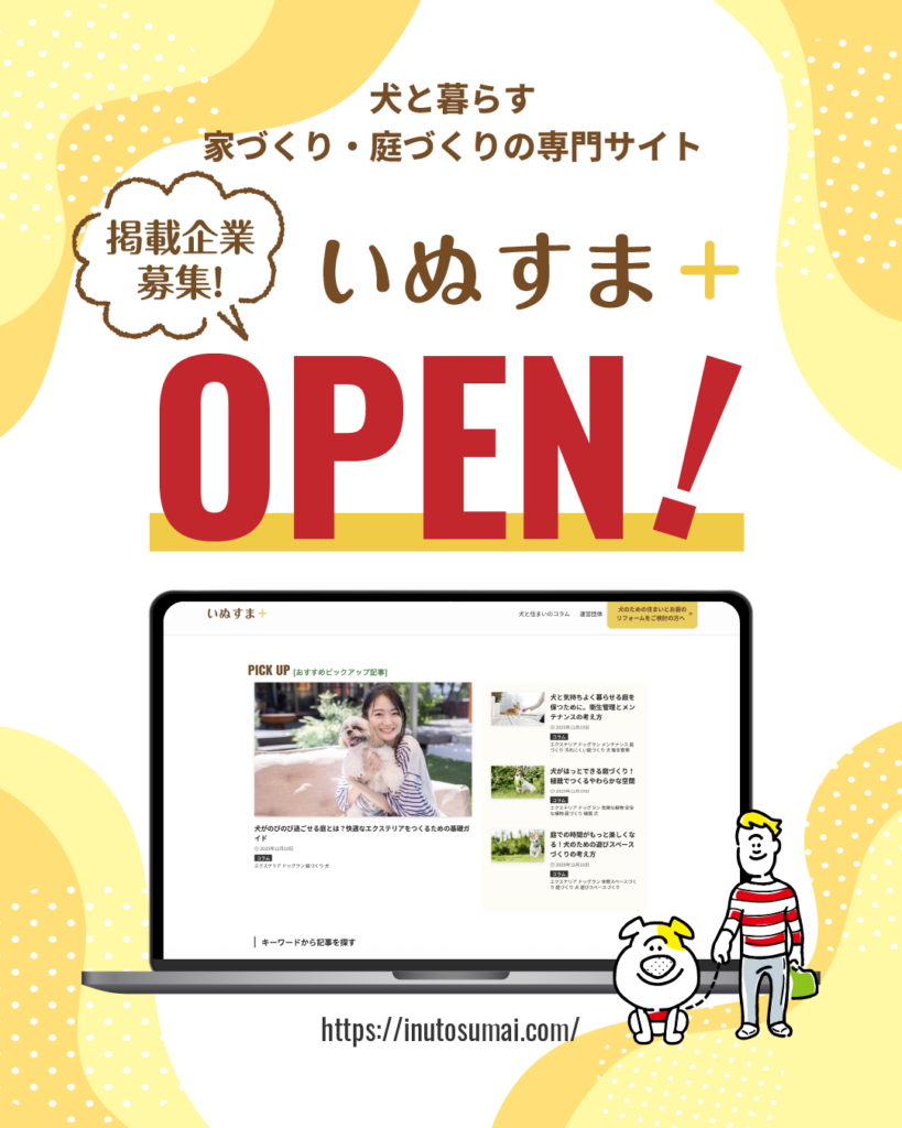 犬と住まいる協会 > お知らせ > 協会からのお知らせ > 【掲載企業様募集】コラムサイトいぬすま+オープンのお知らせ